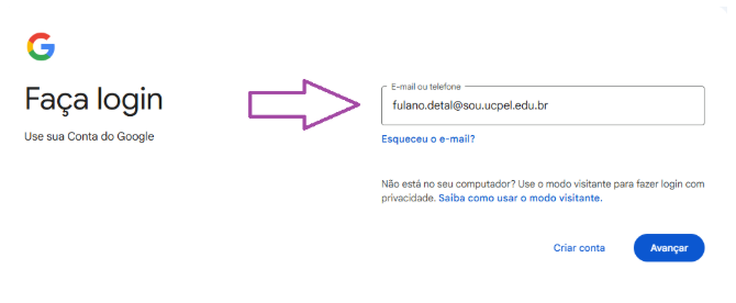 Após, você será direcionado à plataforma Google. Faça login com o seu e-mail institucional - finalizado com @ucpel.edu.br ou com @sou.ucpel.edu.br.