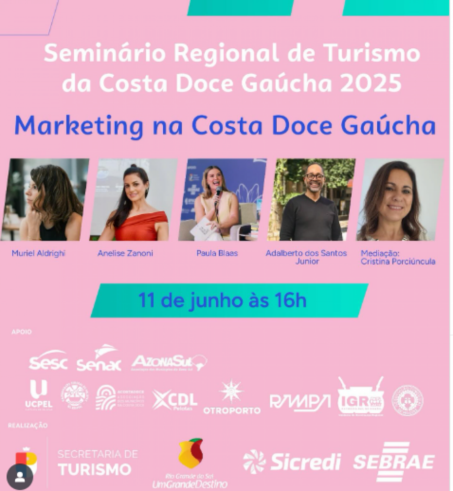 Alunos e docentes dos cursos de Comunicação da Universidade Católica de Pelotas (UCPel) participam do Seminário de Turismo da Costa Doce Gaúcha 2025, que acontece entre os dias 10 e 11 de junho. O evento, promovido pelo Sebrae, oportuniza um ciclo de palestras e é voltado para profissionais e estudantes do setor de empreendedorismo e outras áreas.