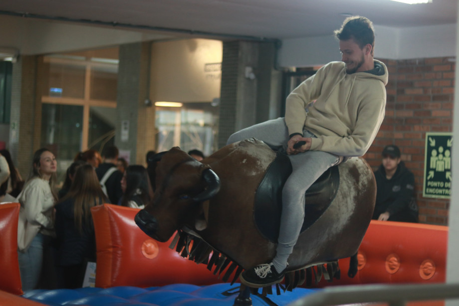Outro grande sucesso do evento foi o touro mecânico. A atividade atraiu estudantes de todas as idades, que, entre tombos e risadas, desafiaram-se a permanecer o máximo de tempo possível montados no brinquedo. O clima foi de competição saudável, animação e muita diversão, criando memórias inesquecíveis para os participantes. Os alunos Felipe Barbosa e Maria Rita, do curso de Psicologia, ficaram 2 minutos e 19 segundos e 1 minuto e 57 segundos, respectivamente, e conquistaram os devidos títulos nas suas categorias.
