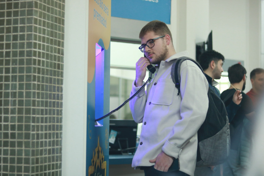 A cabine telefônica foi um dos destaques. A cada toque do telefone, os estudantes que atendiam eram desafiados a responder perguntas. Aqueles que acertavam, ganhavam brindes. Ao longo do dia, a cabine tocou mais de 40 vezes, gerando risadas, curiosidade e até pessoas, com o telefone na mão, esperando a próxima chamada.