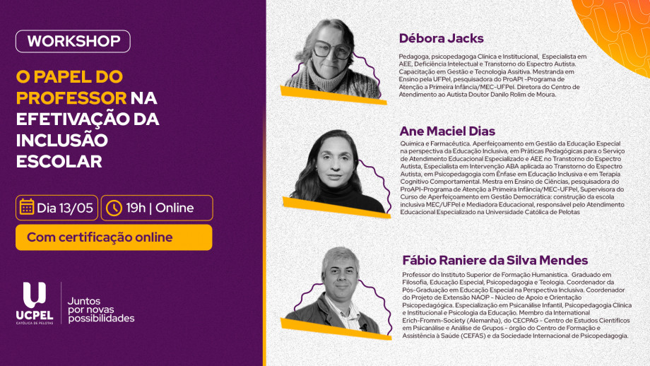 A Universidade Católica de Pelotas (UCPel) promove no dia 13 de maio, às 19h, roda de conversa online com o tema "O Papel do Professor na Efetivação da Inclusão Escolar". A atividade será transmitida ao vivo pelo canal da UCPel no YouTube. O evento é gratuito, com certificação online, e aberto a toda a comunidade interessada no assunto.